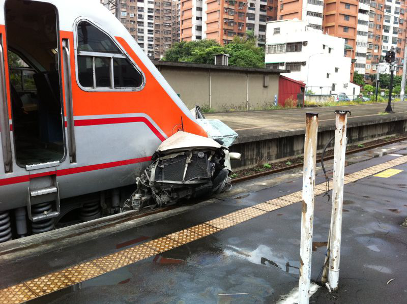 Jou Yi Kao 中午快1點靠近我們這的內壢火車站發生客車,超高速衝破柵欄隨後攬腰遭列車撞上,這是當時的照片。車體扭曲變形