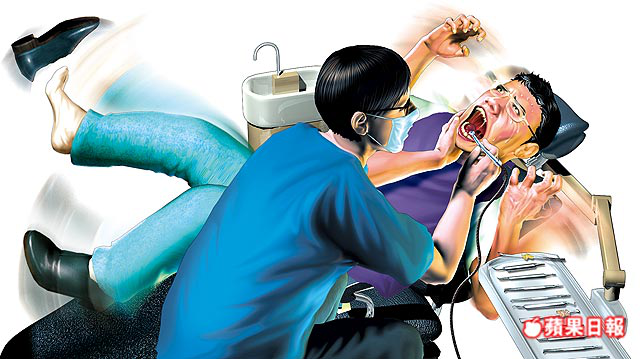 男控牙醫惡意磨牙示意圖 陳威志控訴,他因下排牙齒疼痛腫脹看診,牙醫陳建威說了「一顆子彈改變選舉」後,就磨他的牙齒,讓他痛到不斷掙扎。